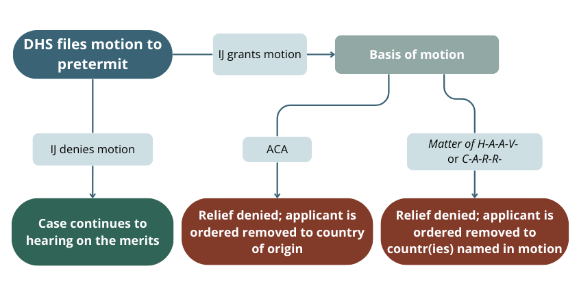 - Asylum Cooperative Agreements (ACAs): Many motions to pretermit are based on Asylum Cooperative Agreements (ACAs), which result in asylum seekers being ordered removed to unsafe third countries. DHS attorneys have been filing ACA-based motions to pretermit en masse in Immigration Court cases, claiming that the asylum applicant is subject to an existing agreement and therefore ineligible for relief. If the motion is granted, the IJ will order the applicant removed to the country named in the motion. See Matter of C-I-G-M- & L-V-S-G-, 29 I&N Dec. 291 (BIA 2025).