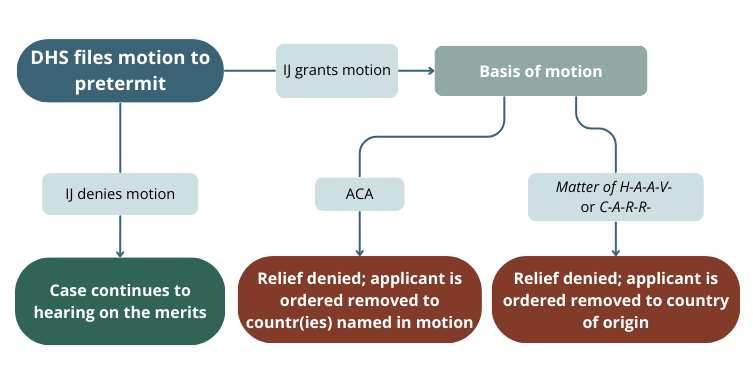 DHS attorneys have been filing motions to pretermit applications for asylum, withholding of removal, and protection under the Convention Against Torture (CAT) in Immigration Court both in advance of hearings as well as orally without notice on the hearing day. If the Immigration Judge (IJ) grants the motion to pretermit, the application for relief is denied. If the IJ denies the motion, the application proceeds to be heard on the merits.